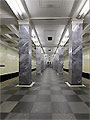 Станция "Сокольники". Станционный зал имеет два ряда по 23 колонны квадратного сечения.