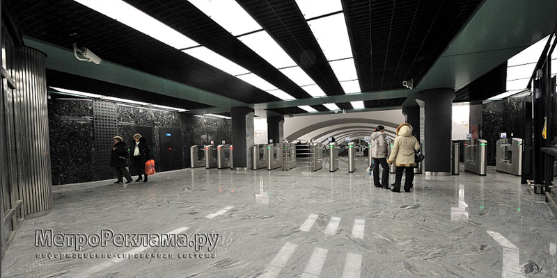 Станция "Зябликово". Балкон подземного вестибюля по входу пассажиров в станционный зал. Справа установлены турникеты по входу, слева - по выходу пассажиров в город на ул. Ясеневая и Воронежская.